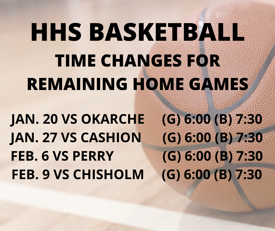 The remaining high school home basketball game start times have been changed to Girls beginning at 6:00 p.m. and the Boys following around 7:30 p.m.